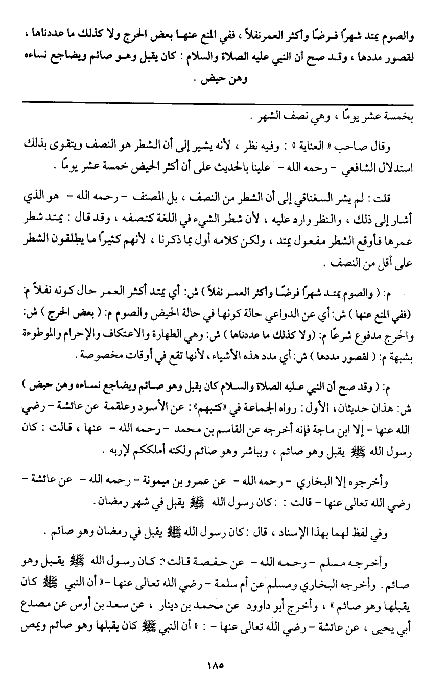 م: (والصوم يمتد شهرا فرضا وأكثر العمر نفلا) ش: أي يمتد أكثر العمر حال كونه نفلا م: (ففي المنع عنها) ش: أي عن الدواعي حالة كونها في حالة الحيض والصوم م: (بعض الحرج) ش: والحرج مدفوع شرعا م: (ولا كذلك ما عددناها) ش: وهي الطهارة والاعتكاف والإحرام والموطوءة بشبهة م: (لقصور مددها) ش: أي مدد هذه الأشياء؛ لأنها تقع في أوقات مخصوصة.