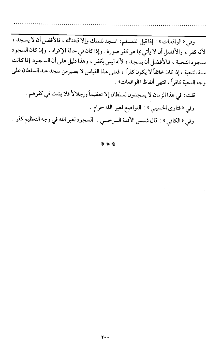 ـــــــــــــــــــــــــــــQوفي " الواقعات ": إذا قيل للمسلم: اسجد للملك وإلا قتلناك، فالأفضل أن لا يسجد، لأنه كفر، والأفضل أن لا يأتي بما هو كفر صورة. وإذا كان في حالة الإكراه، وإن كان السجود سجود التحية، فالأفضل أن يسجد، لأنه ليس بكفر، وهذا دليل على أن السجود إذا كانت سنة التحية، إذا كان خائفا لا يكون كفرا، فعلى هذا القياس لا يصير من سجد عند السلطان على وجه التحية كافرا، انتهى ألفاظ " الواقعات ".
