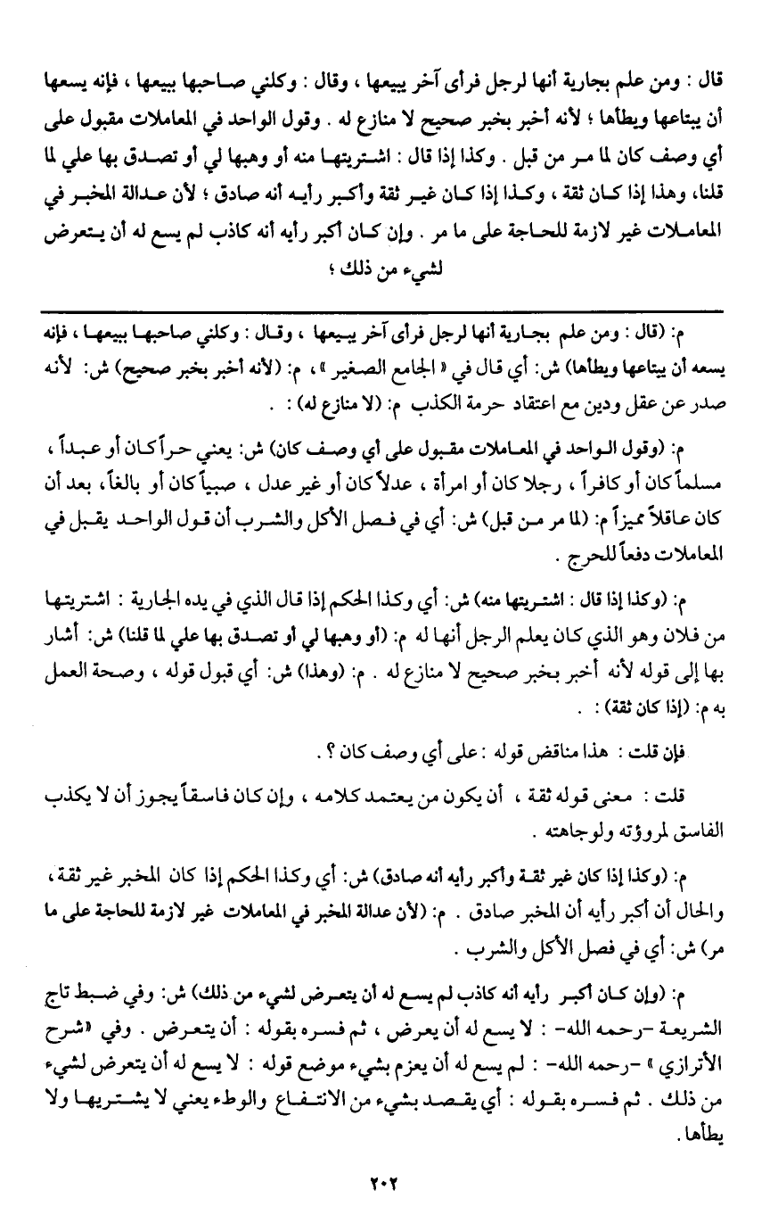 م: (وقول الواحد من المعاملات مقبول على أي وصف كان) ش: يعني حرا كان أو عبدا، مسلما كان أو كافرا، رجلا كان أو امرأة، عدلا كان أو غير عدل، صبيا كان أو بالغا، بعد أن كان عاقلا مميزا م: (لما مر من قبل) ش: أي في فصل الأكل والشرب أن قول الواحد يقبل في المعاملات دفعا للحرج.