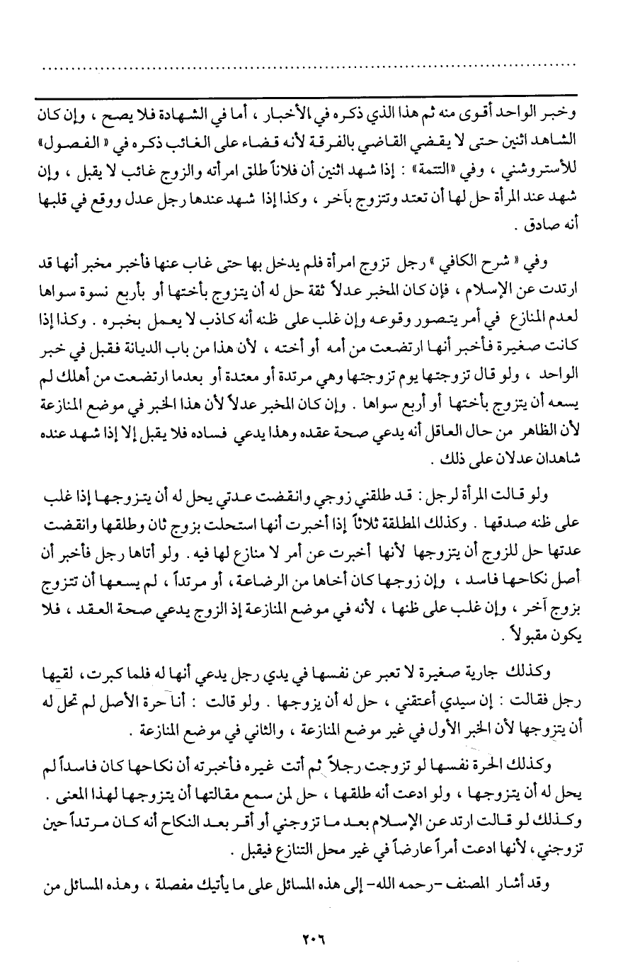 وفي " شرح الكافي " رجل تزوج امرأة فلم يدخل بها حتى غاب عنها فأخبر مخبر أنها قد ارتدت عن الإسلام، فإن كان المخبر عدلا ثقة حل له أن يتزوج بأختها أو بأربع نسوة سواها لعدم المنازع في أمر يتصور وقوعه وإن غلب على ظنه أنه كاذب لا يعمل بخبره. وكذا إذا كانت صغيرة فأخبر أنها ارتضعت من أمه أو أخته؛ لأن هذا من باب الديانة فقبل في خبر الواحد، ولو قال تزوجتها يوم تزوجتها وهي مرتدة أو معتدة أو بعدما ارتضعت من أهلك لم يسعه أن يتزوج بأختها أو أربع سواها. وإن كان المخبر عدلا لأن هذا الخبر في موضع المنازعة لأن الظاهر من حال العاقل أنه يدعي صحة عقده وهذا يدعي فساده فلا يقبل إلا إذا شهد عنده شاهدان عدلان على ذلك.
