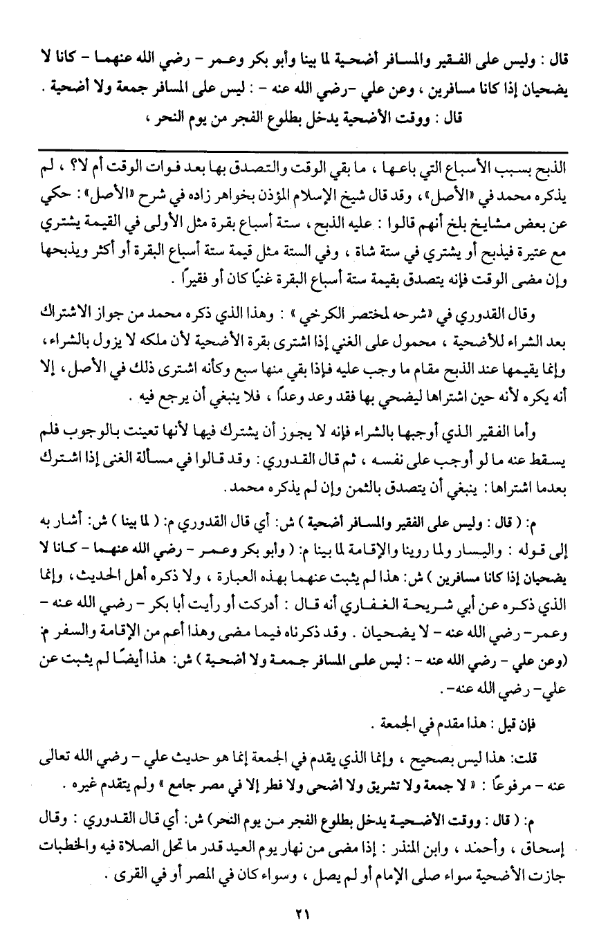 قال: وليس على الفقير والمسافر أضحية لما بينا وأبو بكر وعمر - رَضِيَ اللَّهُ عَنْهُمَا - كانا لا يضحيان إذا كانا مسافرين، وعن علي - رَضِيَ اللَّهُ عَنْهُ -: ليس على المسافر جمعة ولا أضحية.