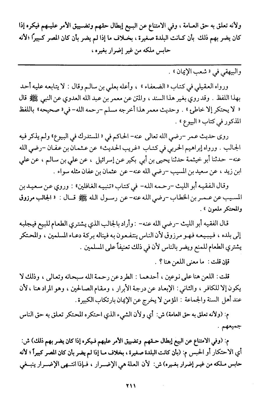 وقال الفقيه أبو الليث - رَحِمَهُ اللَّهُ - في كتاب " تنبيه الغافلين ": وروي عن سعيد بن المسيب عن عمر بن الخطاب - رَضِيَ اللَّهُ عَنْهُ - عن رسول الله- صَلَّى اللَّهُ عَلَيْهِ وَسَلَّمَ - قال: «الجالب مرزوق والمحتكر ملعون» .