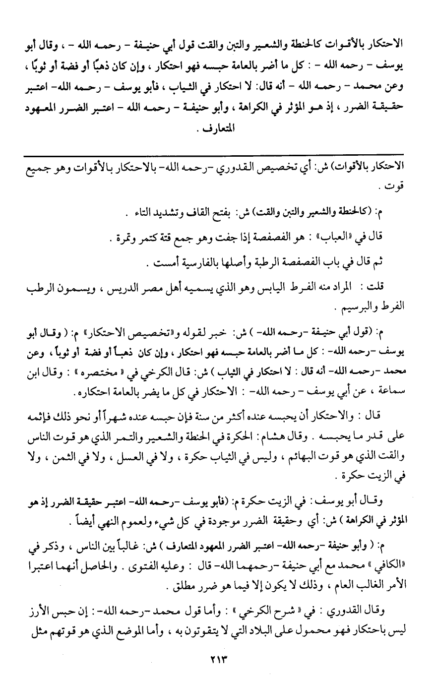 الاحتكار بالأقوات كالحنطة والشعير والتبن والقت قول أبي حنيفة - رَحِمَهُ اللَّهُ -، وقال أبو يوسف - رَحِمَهُ اللَّهُ -: كل ما أضر بالعامة حبسه فهو احتكار، وإن كان ذهبا أو فضة أو ثوبا، وعن محمد - رَحِمَهُ اللَّهُ - أنه قال: لا احتكار في الثياب، فأبو يوسف - رَحِمَهُ اللَّهُ - اعتبر حقيقة الضرر، إذ هو المؤثر في الكراهة، وأبو حنيفة - رَحِمَهُ اللَّهُ - اعتبر الضرر المعهود المتعارف.
