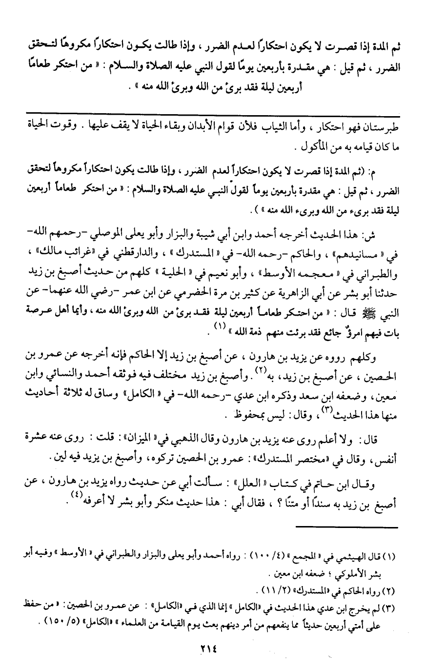 ش: هذا الحديث أخرجه أحمد وابن أبي شيبة والبزار وأبو يعلى الموصلي - رَحِمَهُمُ اللَّهُ - في "مسانيدهم"، والحاكم - رَحِمَهُ اللَّهُ - في " المستدرك "، والدارقطني في " غرائب مالك "، والطبراني في "معجمه الأوسط "، وأبو نعيم في " الحلية " كلهم من حديث أصبغ بن زيد حدثنا أبو بشر عن أبي الزاهرية عن كثير بن مرة الحضرمي عن ابن عمر - رَضِيَ اللَّهُ عَنْهُمَا - عن النبي - صَلَّى اللَّهُ عَلَيْهِ وَسَلَّمَ - قال: «من احتكر طعاما أربعين ليلة فقد برئ من الله وبرئ الله منه، وأيما أهل عرصة بات فيهم امرؤ جائع فقد برئت منهم ذمة الله» .