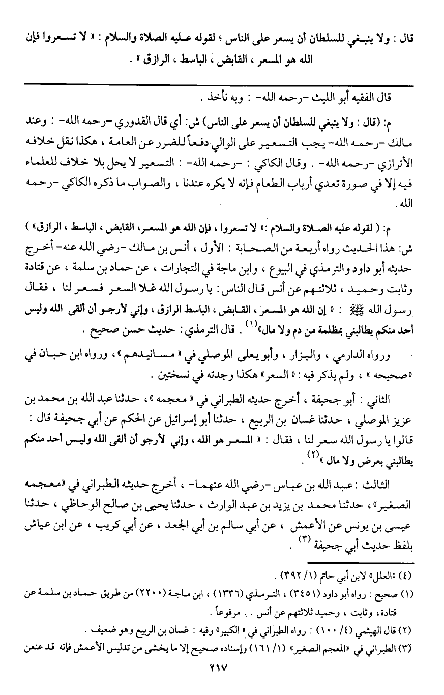 م: (لقوله عليه الصلاة السلام: «لا تسعروا، فإن الله هو المسعر، القابض، الباسط، الرازق» ش: هذا الحديث رواه أربعة من الصحابة: الأول، أنس بن مالك - رَضِيَ اللَّهُ عَنْهُ - أخرج حديثه أبو داود والترمذي في البيوع، وابن ماجه في التجارات، عن حماد بن سلمة، عن قتادة وثابت وحميد، ثلاثتهم عن أنس «قال الناس: يا رسول الله غلا السعر فسعر لنا، فقال رسول الله - صَلَّى اللَّهُ عَلَيْهِ وَسَلَّمَ -: "إن الله هو المسعر، القابض، الباسط الرازق، وإني لأرجو أن ألقى الله وليس أحد منكم يطالبني بمظلمة من دم ولا مال» . قال الترمذي: حديث حسن صحيح.