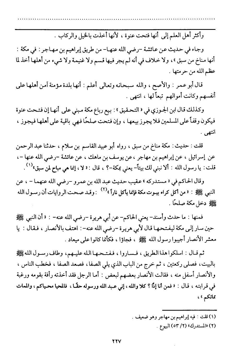 وقال الحاكم في "مستدركه " عقيب حديث عبد الله بن عمرو - رَضِيَ اللَّهُ عَنْهُمَا - عن النبي- صَلَّى اللَّهُ عَلَيْهِ وَسَلَّمَ - «من أكل كراء بيوت مكة فإنما يأكل نارا» : وقد صحت الروايات أن رسول الله - صَلَّى اللَّهُ عَلَيْهِ وَسَلَّمَ - دخل مكة صلحا.