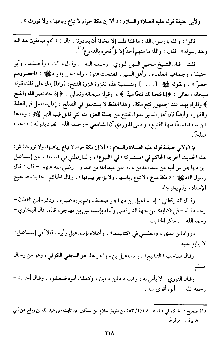 م: (ولأبي حنيفة قوله - عَلَيْهِ الصَّلَاةُ وَالسَّلَامُ -: «ألا إن مكة حرام لا تباع رباعها، ولا تورث» ش: هذا الحديث أخرجه الحاكم في "مستدركه " في "البيوع"، والدارقطني في "سننه "، عن إسماعيل ابن مهاجر عن أبيه عن عبد الله بن باباه عن عبد الله بن عمرو - رَضِيَ اللَّهُ عَنْهُمَا - قال: قال رسول الله - صَلَّى اللَّهُ عَلَيْهِ وَسَلَّمَ -: «مكة مناخ، لا تباع رباعها، ولا يؤاجر بيوتها» . وقال الحاكم: حديث صحيح الإسناد، ولم يخرجاه.