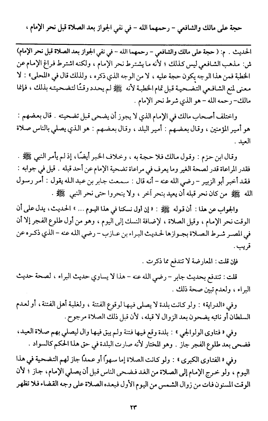 وقال ابن حزم: وقول مالك فلا حجة به، وخلاف الخبر أيضا، إذ لم يأمر النبي - صَلَّى اللَّهُ عَلَيْهِ وَسَلَّمَ -. فقدر المراعاة قدر لصحة الغير وما يعرف في مراعاة تضحية الإمام عن أحد قبله. قيل في جوابه: فقد أخبر أبو الزبير - رَضِيَ اللَّهُ عَنْهُ - أنه قال: سمعت جابر بن عبد الله يقول: «أمر رسول الله - صَلَّى اللَّهُ عَلَيْهِ وَسَلَّمَ - من كان نحر قبله أن يعيد بنحر آخر، ولا ينحروا حتى نحر النبي - صَلَّى اللَّهُ عَلَيْهِ وَسَلَّمَ -» .