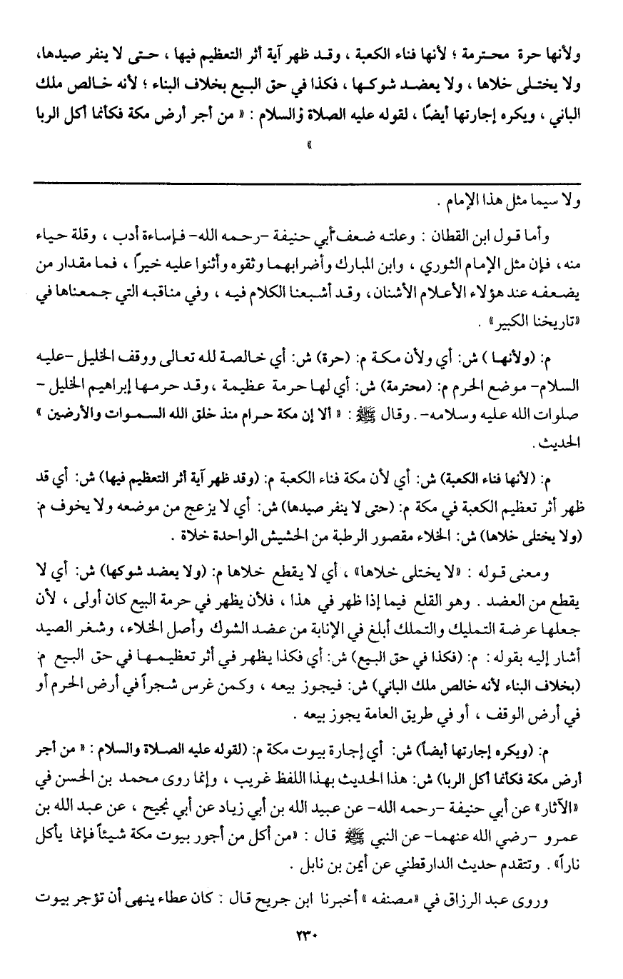 م: (ولأنها) ش: أي ولأن مكة م: (حرة) ش: أي خالصة لله تعالى ووقف الخليل - عَلَيْهِ السَّلَامُ - موضع الحرم م: (محترمة) ش: أي لها حرمة عظيمة، وقد حرمها إبراهيم الخليل - صَلَوَاتُ اللَّهِ عَلَيْه وسلامه-. وقال - صَلَّى اللَّهُ عَلَيْهِ وَسَلَّمَ -: «ألا إن مكة حرام منذ خلق الله السماوات والأرضين» الحديث.