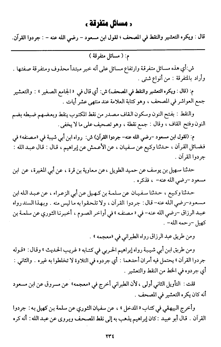 قال: ويكره التعشير والنقط في المصحف، لقول ابن مسعود - رَضِيَ اللَّهُ عَنْهُ -: جردوا القرآن.