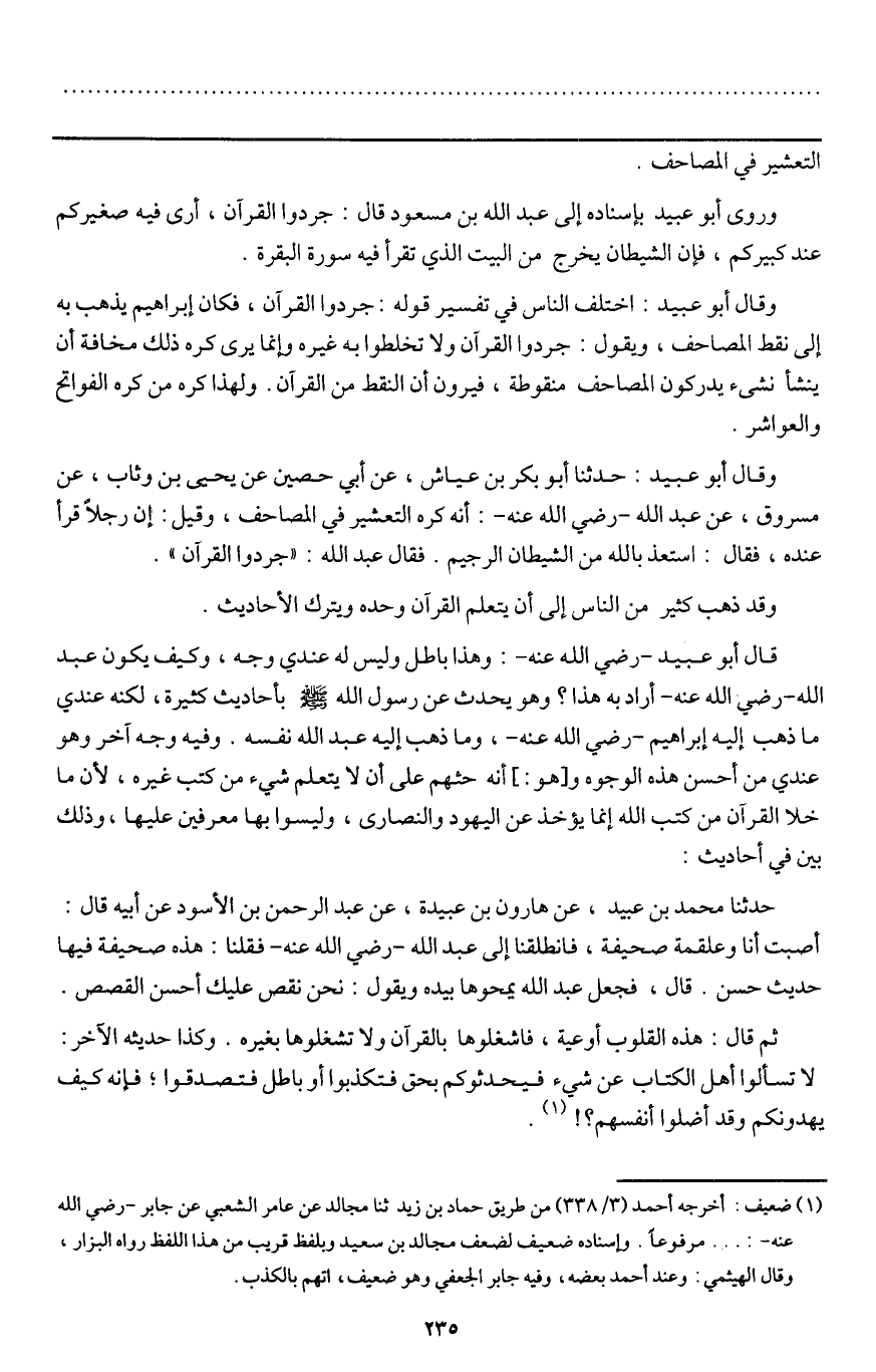 وقال أبو عبيد: حدثنا أبو بكر بن عياش، عن أبي حصين عن يحيى بن وثاب، عن مسروق، عن عبد الله - رَضِيَ اللَّهُ عَنْهُ -: أنه كره التعشير في المصاحف، وقيل: إن رجلا قرأ عنده، فقال: استعذ بالله من الشيطان الرجيم. فقال عبد الله: "جردوا القرآن ".