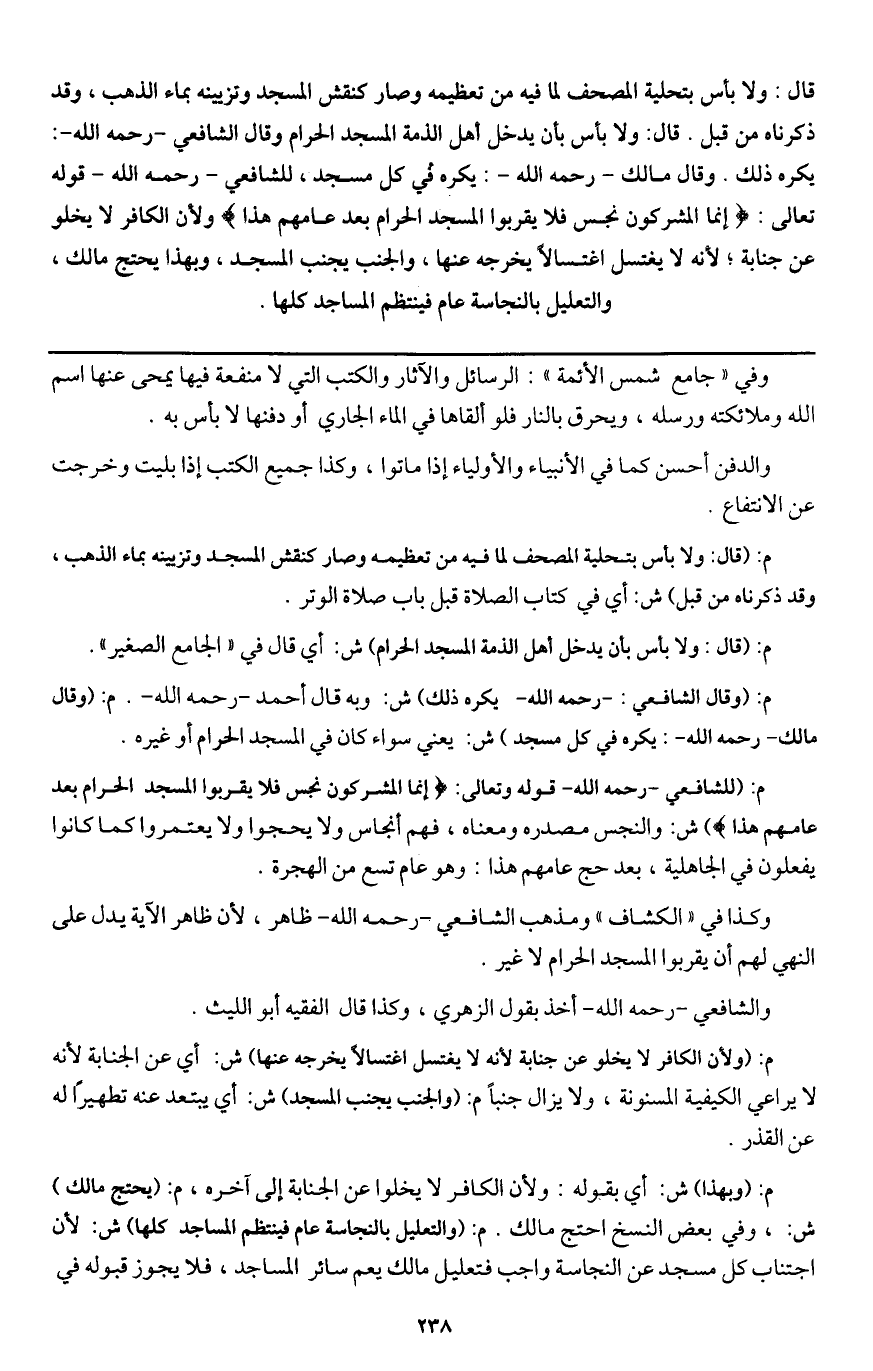 م: (للشافعي - رَحِمَهُ اللَّهُ - قَوْله تَعَالَى: {إِنَّمَا الْمُشْرِكُونَ نَجَسٌ فَلَا يَقْرَبُوا الْمَسْجِدَ الْحَرَامَ بَعْدَ عَامِهِمْ هَذَا} [التوبة: 28] ش: والنجس مصدره ومعناه، فهم أنجاس ولا يحجوا ولا يعتمروا كما كانوا يفعلون في الجاهلية، بعد حج عامهم هذا: وهو عام تسع من الهجرة.