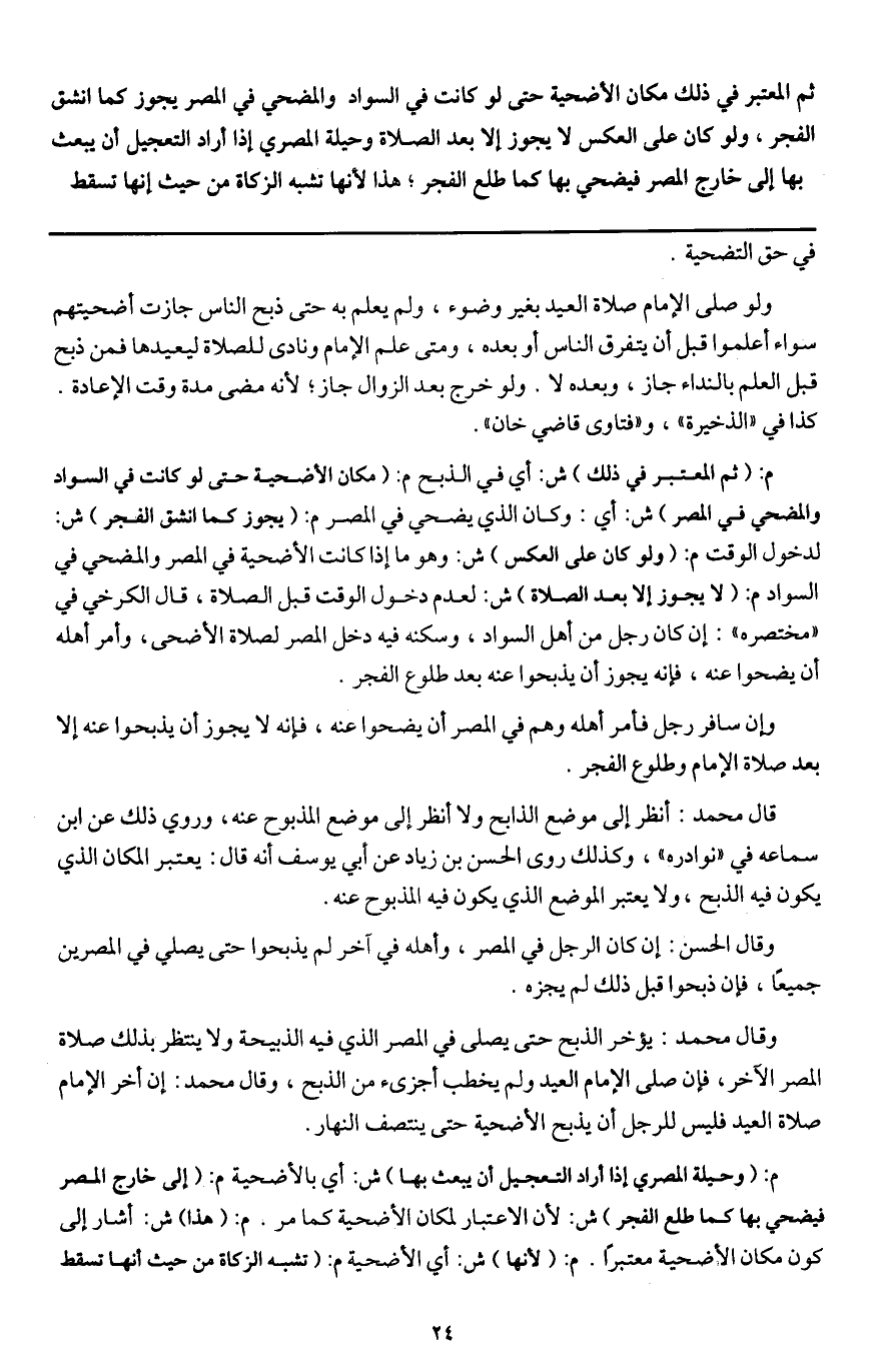 وقال محمد: يؤخر الذبح حتى يصلى في المصر الذي فيه الذبيحة ولا ينتظر بذلك صلاة المصر الآخر، فإن صلى الإمام العيد ولم يخطب أجزئ من الذبح، وقال محمد: إن أخر الإمام صلاة العيد فليس للرجل أن يذبح الأضحية حتى ينتصف النهار.