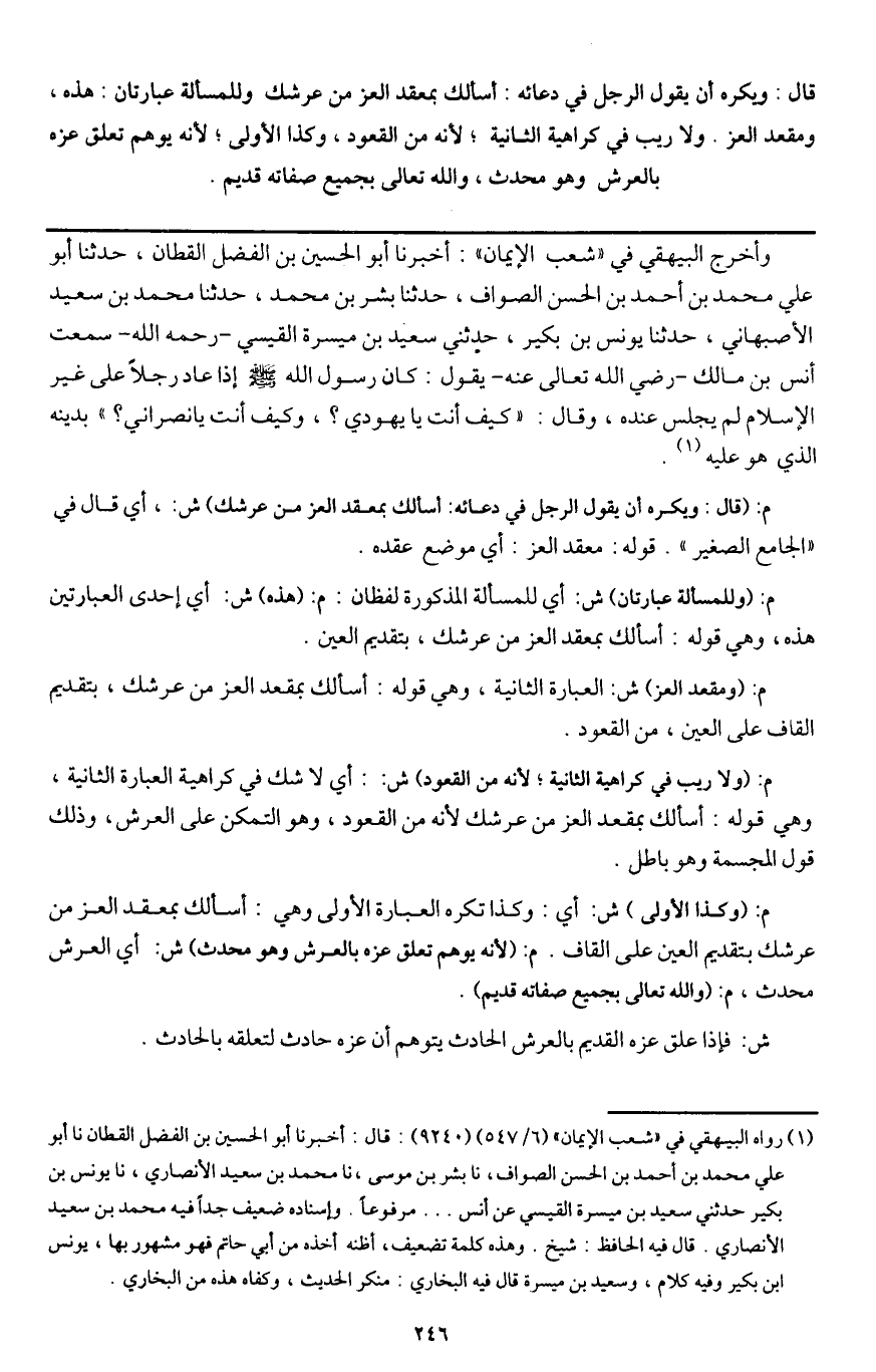 قال: ويكره أن يقول الرجل في دعائه: أسألك بمعقد العز من عرشك وللمسألة عبارتان: هذه، ومقعد العز. ولا ريب في كراهية الثانية؛ لأنه من القعود، وكذا الأولى؛ لأنه يوهم تعلق عزه بالعرش وهو محدث، والله تعالى بجميع صفاته قديم.