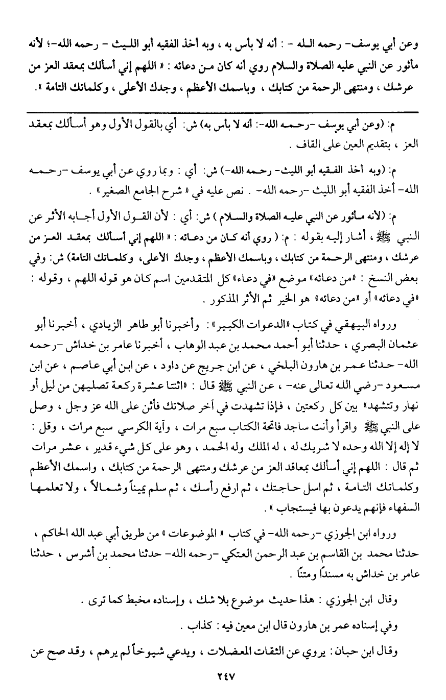 ورواه البيهقي في كتاب " الدعوات الكبير ": وأخبرنا أبو طاهر الزيادي، أخبرنا أبو عثمان البصري، حدثنا أبو أحمد محمد بن عبد الوهاب، أخبرنا عامر بن خداش - رَحِمَهُ اللَّهُ - حدثنا عمر بن هارون البلخي، عن ابن جريج عن داود، عن ابن أبي عاصم، عن ابن مسعود - رَضِيَ اللَّهُ تَعَالَى عَنْهُ -، عن النبي - صَلَّى اللَّهُ عَلَيْهِ وَسَلَّمَ - قال: «اثنتا عشرة ركعة تصليهن من ليل أو نهار وتتشهد" بين كل ركعتين، فإذا تشهدت في آخر صلاتك فأثن على الله عز وجل، وصل على النبي - صَلَّى اللَّهُ عَلَيْهِ وَسَلَّمَ - واقرأ وأنت ساجد فاتحة الكتاب سبع مرات، وآية الكرسي سبع مرات، وقل: لا إله إلا الله وحده لا شريك له، له الملك وله الحمد، وهو على كل شيء قدير، عشر مرات ثم قال: اللهم إني أسألك بمعاقد العز من عرشك ومنتهى الرحمة من كتابك، واسمك الأعظم وكلماتك التامة، ثم اسل حاجتك، ثم ارفع رأسك، ثم سلم يمينا وشمالا، ولا تعلمها السفهاء فإنهم يدعون بها فيستجاب» .