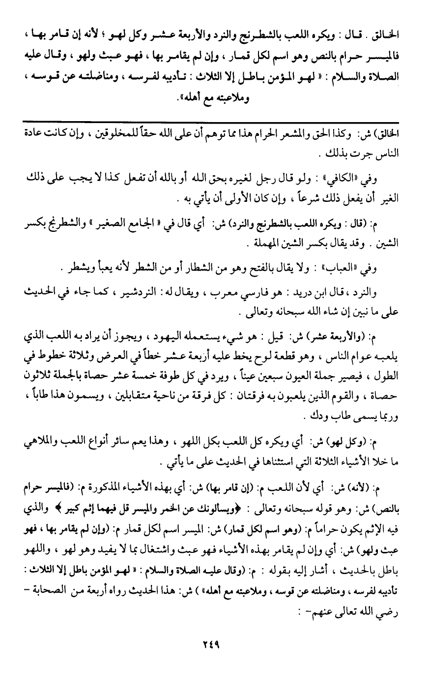الخالق. قال: ويكره اللعب بالشطرنج والنرد والأربعة عشر وكل لهو؛ لأنه إن قامر بها، فالميسر حرام بالنص وهو اسم لكل قمار، وإن لم يقامر بها، فهو عبث ولهو، وقال - عَلَيْهِ الصَّلَاةُ وَالسَّلَامُ -: «لهو المؤمن باطل إلا الثلاث: تأديبه لفرسه، ومناضلته عن قوسه، وملاعبته مع أهله» .