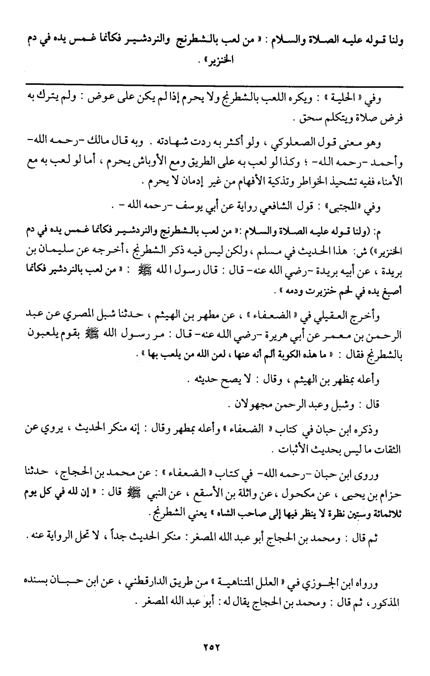 وروى ابن حبان - رَحِمَهُ اللَّهُ - في كتاب " الضعفاء ": عن محمد بن الحجاج، حدثنا حزام بن يحيى، عن مكحول، عن واثلة بن الأسقع، عن النبي - صَلَّى اللَّهُ عَلَيْهِ وَسَلَّمَ - قال: «إن الله في كل يوم ثلاثمائة وستين نظرة لا ينظر فيها إلى صاحب الشاه» يعني الشطرنج.