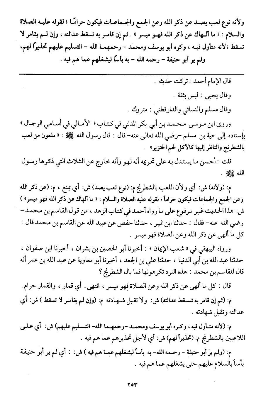 ولأنه نوع لعب يصد عن ذكر الله وعن الجمع والجماعات فيكون حراما؛ لقوله - عَلَيْهِ الصَّلَاةُ وَالسَّلَامُ -: «ما ألهاك عن ذكر الله فهو ميسر» . ثم إن قامر به تسقط عدالته، وإن لم يقامر لا تسقط؛ لأنه متأول فيه، وكره أبو يوسف ومحمد -رحمهما الله- التسليم عليهم تحذيرا لهم، ولم ير أبو حنيفة - رَحِمَهُ اللَّهُ - به بأسا ليشغلهم عما هم فيه