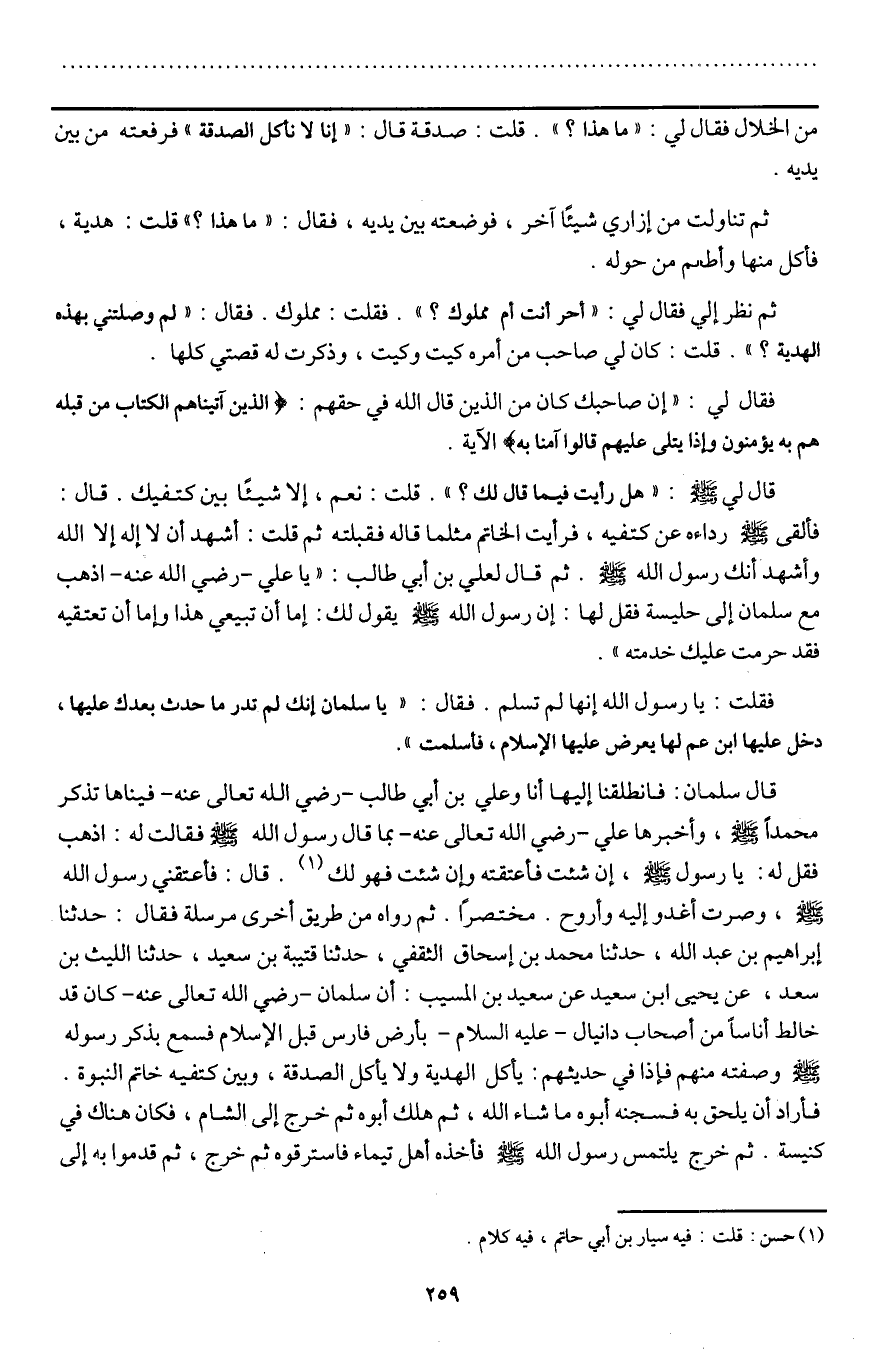 قال سلمان: فانطلقنا إليها أنا وعلي بن أبي طالب - رَضِيَ اللَّهُ تَعَالَى عَنْهُ - فرأيناها تذكر محمدا - صَلَّى اللَّهُ عَلَيْهِ وَسَلَّمَ -، وأخبرها علي - رَضِيَ اللَّهُ تَعَالَى عَنْهُ - بما قال رسول الله - صَلَّى اللَّهُ عَلَيْهِ وَسَلَّمَ - فقالت له: اذهب فقل له: يا رسول الله - صَلَّى اللَّهُ عَلَيْهِ وَسَلَّمَ -، إن شئت فأعتقته وإن شئت فهو لك. قال: فأعتقني رسول الله - صَلَّى اللَّهُ عَلَيْهِ وَسَلَّمَ -، وصرت أغدو إليه وأروح» . مختصرا. ثم رواه من طريق آخرى مرسلة فقال: حدثنا إبراهيم بن عبد الله، حدثنا محمد بن إسحاق الثقفي، حدثنا قتيبة بن سعيد، حدثنا الليث بن سعد، عن يحيى بن سعيد عن سعيد بن المسيب: «أن سلمان - رَضِيَ اللَّهُ تَعَالَى عَنْهُ - كان قد خالط أناسا من أصحاب دانيال - عَلَيْهِ السَّلَامُ - بأرض فارس قبل الإسلام فسمع بذكر رسوله - صَلَّى اللَّهُ عَلَيْهِ وَسَلَّمَ - وصفته منهم فإذا في حديثهم: يأكل الهدية ولا يأكل الصدقة، وبين كتفيه خاتم النبوة. فأراد أن يلحق به فسجنه أبوه ما شاء الله، ثم هلك أبوه ثم خرج إلى الشام، فكان هناك في كنيسة. ثم خرج يلتمس رسول الله - صَلَّى اللَّهُ عَلَيْهِ وَسَلَّمَ - فأخذه أهل تيماء فاسترقوه ثم خرج، ثم قدموا به إلى
