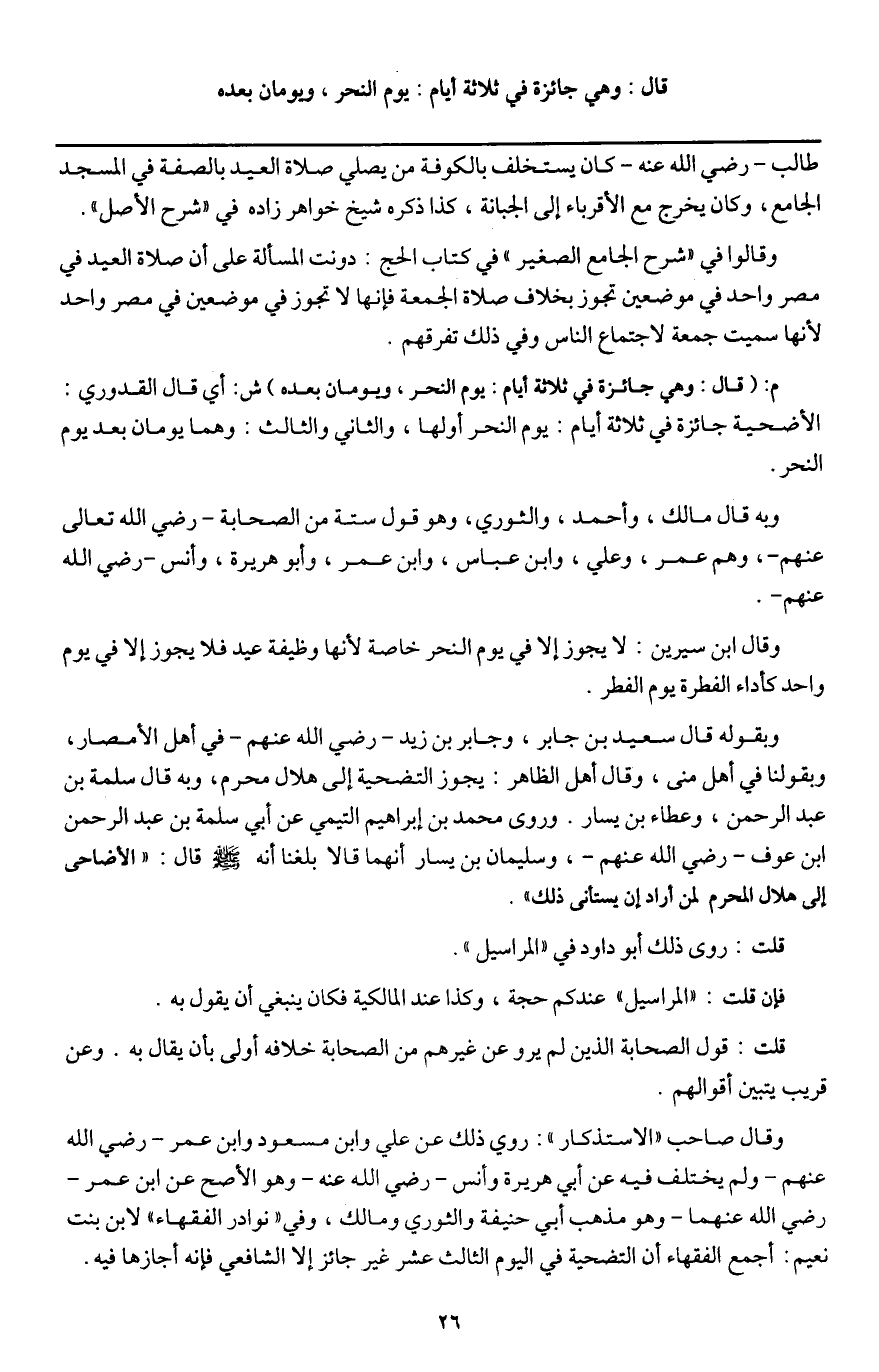 وقال صاحب " الاستذكار ": روي ذلك عن علي وابن مسعود وابن عمر - رَضِيَ اللَّهُ عَنْهُمْ - ولم يختلف فيه عن أبي هريرة وأنس - رَضِيَ اللَّهُ عَنْهُ - وهو الأصح عن ابن عمر - رَضِيَ اللَّهُ عَنْهُمَا - وهو مذهب أبي حنيفة والثوري ومالك، وفي " نوادر الفقهاء " لابن بنت نعيم: أجمع الفقهاء أن التضحية في اليوم الثالث عشر غير جائز إلا الشافعي فإنه أجازها فيه.