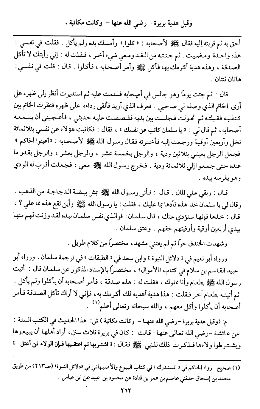 ورواه أبو نعيم في " دلائل النبوة " وابن سعد في " الطبقات " في ترجمة سلمان. ورواه أبو عبيد القاسم بن سلام في كتاب " الأموال "، مختصرا بالإسناد المذكور عن سلمان قال: «أتيت رسول الله - صَلَّى اللَّهُ عَلَيْهِ وَسَلَّمَ - بطعام وأنا مملوك، فقلت له: هذه صدقة، فأمر أصحابه أن يأكلوا ولم يأكل. ثم أتيته بطعام آخر فقلت: هذا هدية أهديه لك أكرمك به، فإني لا أراك تأكل الصدقة فأمر أصحابه أن يأكلوا وأكل معهم» والله سبحانه وتعالى أعلم.