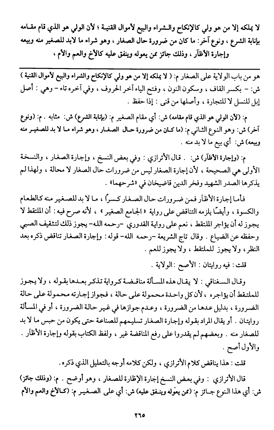وقال السغناقي: لا يقال هذه المسألة مناقضة كرواية تذكر بعدها بقوله، ولا يجوز للملتقط أن يؤاجره، لأن كل واحدة محمولة على حالة، فجواز إجارته محمولة على حالة الضرورة، بدليل عدها من الضرورة، وعدم جوازها في غير حالة الضرورة، أو في المسألة روايتان. أو يقال المراد بقوله وإجارة الصغار تسليمهم للصناعة حتى يكون من حبس ما لا بد للصغار منه. وبعضهم لم يقدروا على رفع المناقضة غير، ولفظ الكتاب بقوله وإجارة الأظار. والأول أصح.