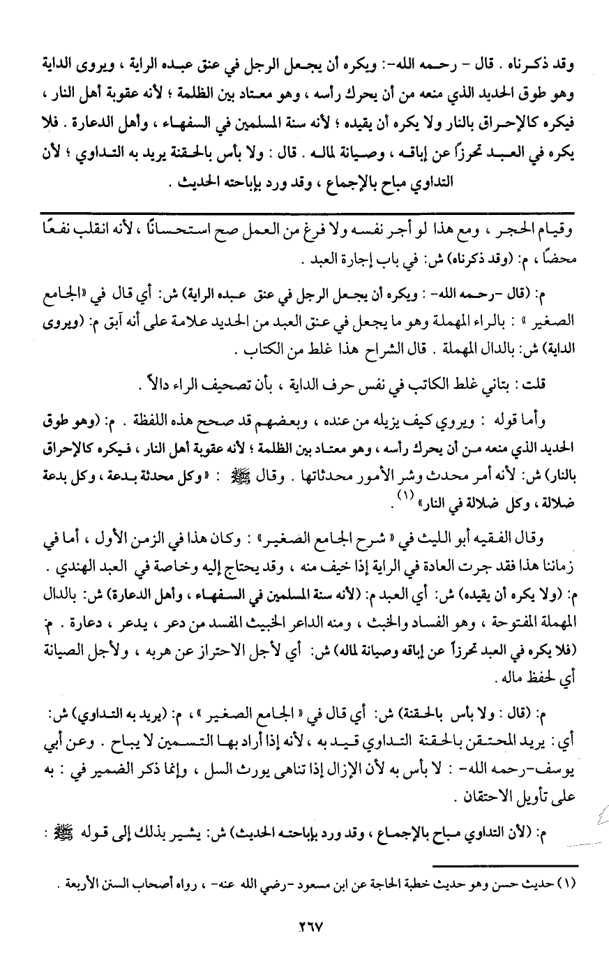 قال - رَحِمَهُ اللَّهُ -: ويكره أن يجعل الرجل في عنق عبده الراية، ويروى الداية وهو طوق الحديد الذي منعه من أن يحرك رأسه، وهو معتاد بين الظلمة؛ لأنه عقوبة أهل النار، فيكره كالإحراق بالنار ولا يكره أن يقيده؛ لأنه سنة المسلمين في السفهاء، وأهل الدعارة. فلا يكره في العبد تحرزا عن إباقه، وصيانة لماله.