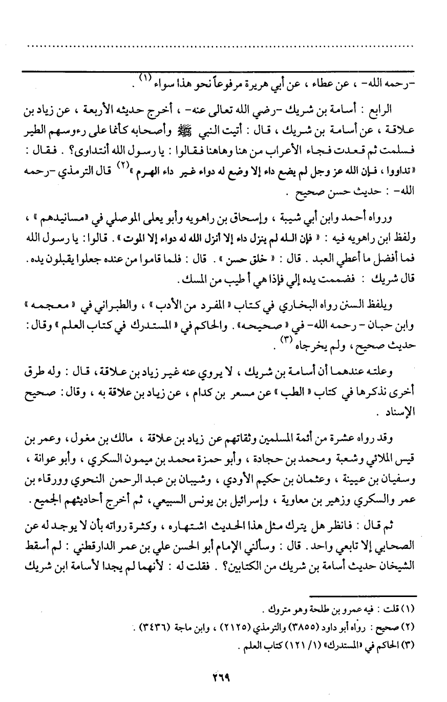 وعلته عندهما أن أسامة بن شريك، لا يروي عنه غير زياد بن علاقة، قال: وله طرق أخرى نذكرها في كتاب " الطب " عن مسعر بن كدام، عن زياد بن علاقة به، وقال: صحيح الإسناد.