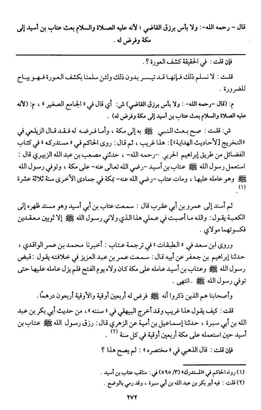 ش: قلت: صح بعث النبي - صَلَّى اللَّهُ عَلَيْهِ وَسَلَّمَ - به إلى مكة، وأما فرضه له فقد قال الزيلعي في " التخريج [الأحاديث الهداية "] : هذا غريب، ثم قال: روى الحاكم في " مستدركه " في كتاب الفضائل من طريق إبراهيم الحربي - رَحِمَهُ اللَّهُ -، حدثني مصعب بن عبد الله الزبيري قال: «استعمل رسول الله - صَلَّى اللَّهُ عَلَيْهِ وَسَلَّمَ - عتاب بن أسيد - رَضِيَ اللَّهُ تَعَالَى عَنْهُ - على مكة، وتوفي رسول الله - صَلَّى اللَّهُ عَلَيْهِ وَسَلَّمَ - وهو عامله عليها، ومات عتاب - رَضِيَ اللَّهُ عَنْهُ - بمكة في جمادى الأخرى سنة ثلاث عشرة» .