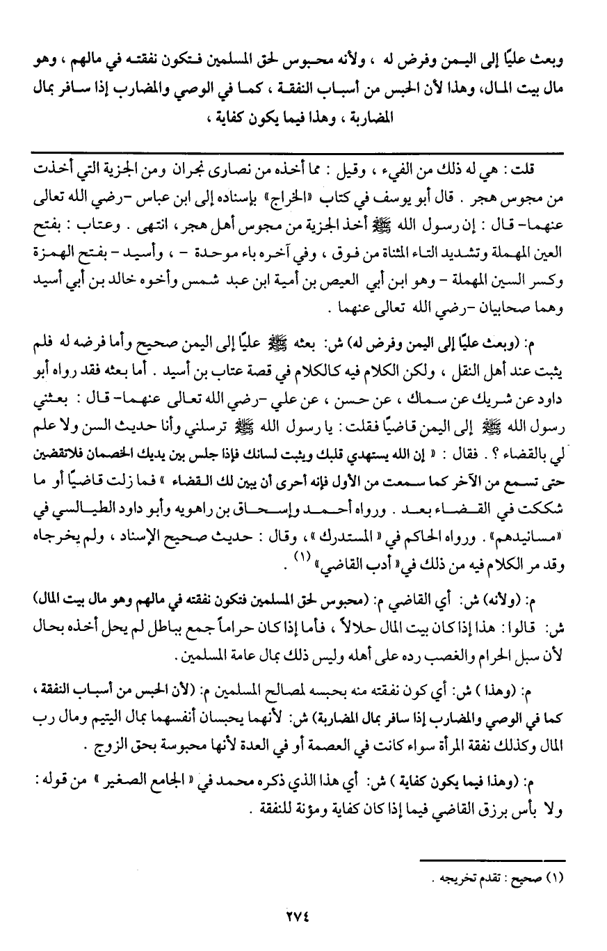 وبعث عليا إلى اليمن وفرض له، ولأنه محبوس لحق المسلمين فتكون نفقته في مالهم، وهو مال بيت المال، وهذا لأن الحبس من أسباب النفقة، كما في الوصي والمضارب إذا سافر بمال المضاربة، وهذا فيما يكون كفاية،