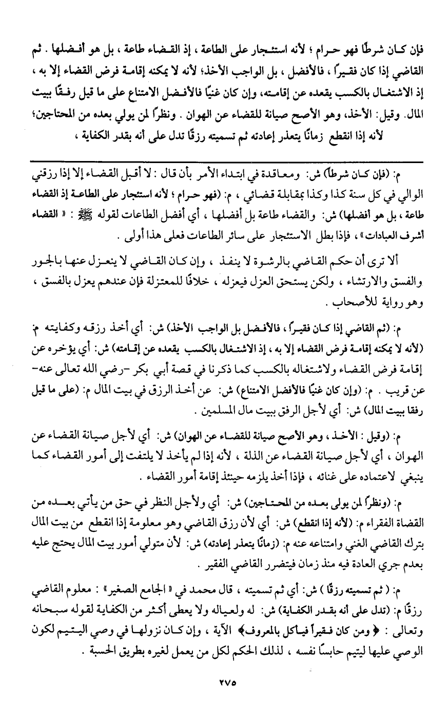 ـــــــــــــــــــــــــــــQم: (فإن كان شرطا) ش: ومعاقدة في ابتداء الأمر بأن قال: لا أقبل القضاء إلا إذا رزقني الوالي في كل سنة كذا وكذا بمقابلة قضائي، م: (فهو حرام؛ لأنه استئجار على الطاعة إذ القضاء طاعة، بل هو أفضلها) ش: والقضاء طاعة بل أفضلها، أي أفضل الطاعات لقوله - صَلَّى اللَّهُ عَلَيْهِ وَسَلَّمَ -: «القضاء أشرف العبادات» ، فإذا بطل الاستئجار على سائر الطاعات فعلى هذا أولى.