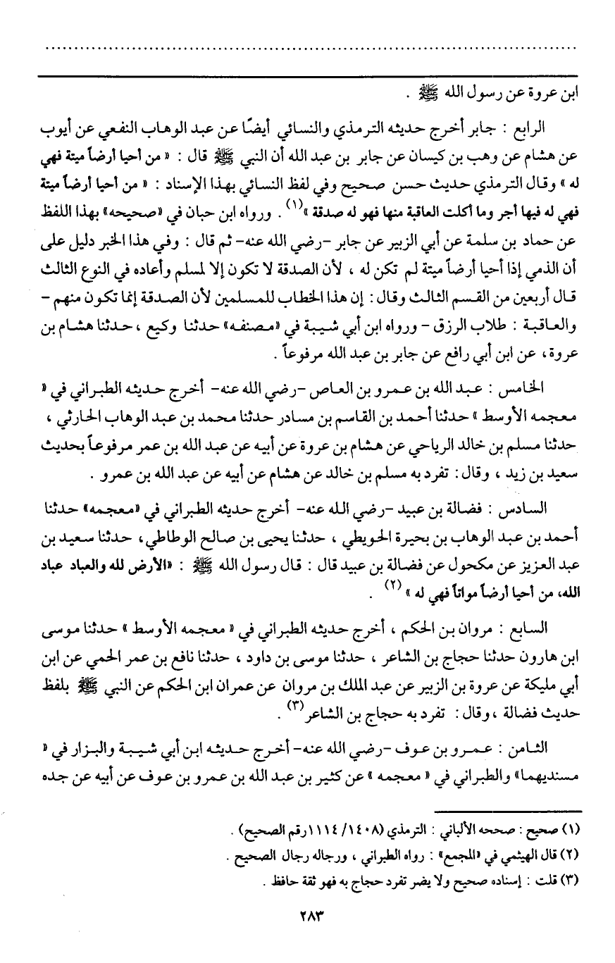 السادس: فضالة بن عبيد - رَضِيَ اللَّهُ عَنْهُ - أخرج حديثه الطبراني في " معجمه " حدثنا أحمد بن عبد الوهاب بن بحيرة الحويطي، حدثنا يحيى بن صالح الوطاطي، حدثنا سعيد بن عبد العزيز عن مكحول عن فضالة بن عبيد قال: قال رسول الله - صَلَّى اللَّهُ عَلَيْهِ وَسَلَّمَ -: «الأرض لله والعباد عباد الله، من أحيا أرضا مواتا فهي له» .