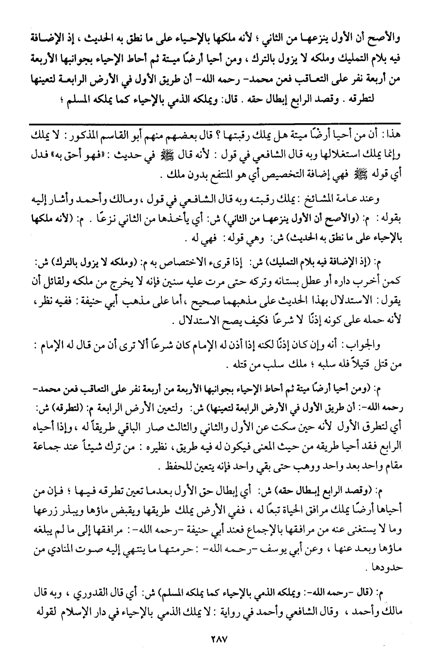 ـــــــــــــــــــــــــــــQهذا: أن من أحيا أرضا ميتة هل يملك رقبتها؟ قال بعضهم منهم أبو القاسم المذكور: لا يملك وإنما يملك استغلالها وبه قال الشافعي في قول: لأنه قال - صَلَّى اللَّهُ عَلَيْهِ وَسَلَّمَ - في حديث: «فهو أحق به» فدل أي قوله - صَلَّى اللَّهُ عَلَيْهِ وَسَلَّمَ - فهي إضافة التخصيص أي هو المنتفع بدون ملك.