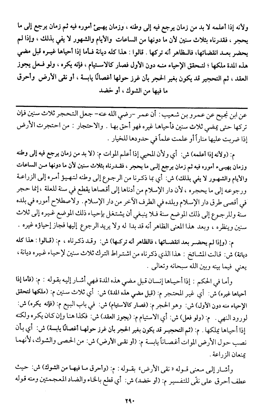 ـــــــــــــــــــــــــــــQعن ابن نجيح عن عمرو بن شعيب: أن عمر - رَضِيَ اللَّهُ عَنْهُ - جعل التحجر ثلاث سنين فإن تركها حتى يمضي ثلاث سنين فأحياها غيره فهو أحق بها. والاحتجار: من احتجرت الأرض إذا ضربت عليها منارا أو علمت علما في حدودها للخيار.