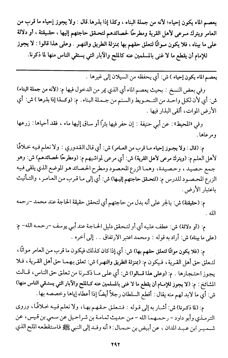 يعصم الماء يكون إحياء؛ لأنه من جملة البناء، وكذا إذا بذرها. قال: ولا يجوز إحياء ما قرب من العامر ويترك مرعى لأهل القرية ومطرحا لحصائدهم لتحقق حاجتهم إليها، حقيقته، أو دلالة على ما بيناه، فلا يكون مواتا لتعلق حقهم بها بمنزلة الطريق والنهر. وعلى هذا قالوا: لا يجوز للإمام أن يقطع ما لا غنى بالمسلمين عنه كالملح والآبار التي يستقي الناس منها لما ذكرنا.