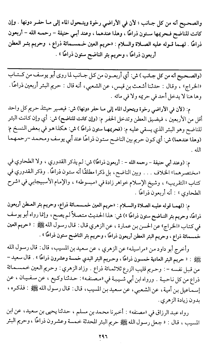 م: (لهما قوله - عَلَيْهِ الصَّلَاةُ وَالسَّلَامُ -: «حريم العين خمسمائة ذراع، وحريم بئر العطن أربعون ذراعا، وحريم بئر الناضح ستون ذراعا» ش: هذا الحديث متصلا لم يصح، وإنما رواه أبو يوسف في كتاب " الخراج " عن الحسن بن عمارة، عن الزهري قال: قال رسول الله - صَلَّى اللَّهُ عَلَيْهِ وَسَلَّمَ -: «حريم العين خمسمائة ذراع، وحريم البئر العطن أربعون ذراعا، وحريم بئر الناضح ستون ذراعا» .