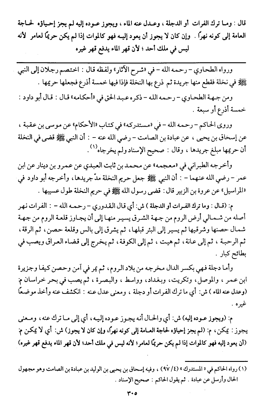 ـــــــــــــــــــــــــــــQورواه الطحاوي - رَحِمَهُ اللَّهُ - في " شرح الآثار " ولفظه قال: «اختصم رجلان إلى النبي - صَلَّى اللَّهُ عَلَيْهِ وَسَلَّمَ - في نخلة فقطع منها جريدة ثم ذرع بها النخلة فإذا فيها خمسة أذرع فجعلها حريمها» .
