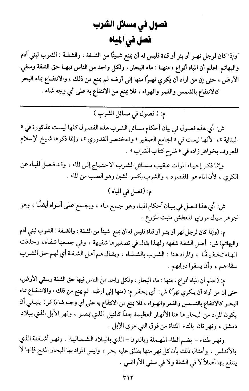 وإذا كان لرجل نهر أو بئر أو قناة فليس له أن يمنع شيئا من الشفة، والشفة: الشرب لبني آدم والبهائم، اعلم أن المياه أنواع، منها: ماء البحار، ولكل واحد من الناس فيها حق الشفة وسقي الأرض، حتى إن من أراد أن يكري نهرا منها إلى أرضه لم يمنع من ذلك، والانتفاع بماء البحر كالانتفاع بالشمس والقمر والهواء، فلا يمنع من الانتفاع به على أي وجه شاء.