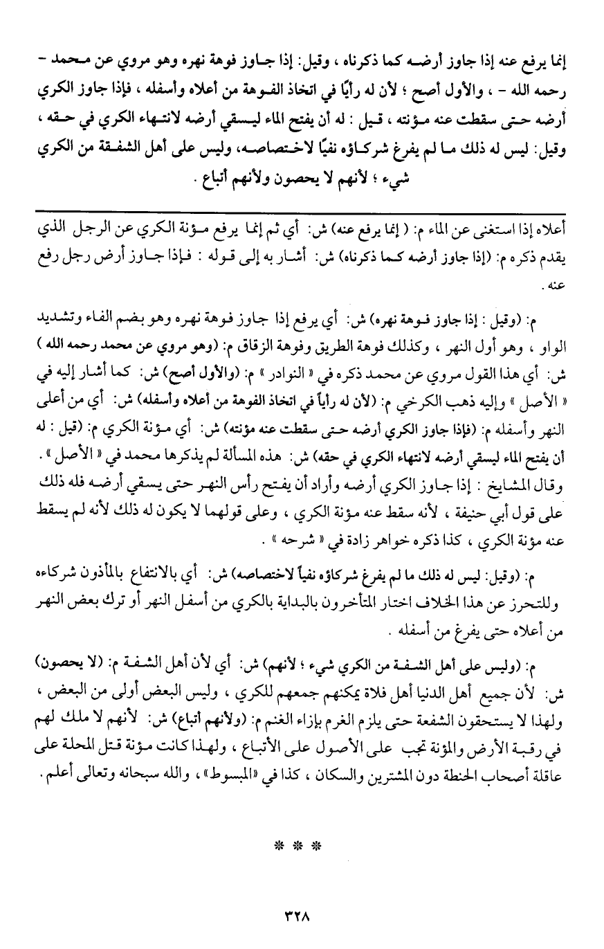 إنما يرفع عنه إذا جاوز أرضه كما ذكرناه، وقيل: إذا جاوز فوهة نهره وهو مروي عن محمد - رَحِمَهُ اللَّهُ -، والأول أصح؛ لأن له رأيا في اتخاذ الفوهة من أعلاه وأسفله، فإذا جاوز الكري أرضه حتى سقطت عنه مؤنته، قيل: له أن يفتح الماء ليسقي أرضه لانتهاء الكري في حقه، وقيل: ليس له ذلك ما لم يفرغ شركاؤه نفيا لاختصاصه، وليس على أهل الشفقة من الكري شيء؛ لأنهم لا يحصون ولأنهم أتباع.