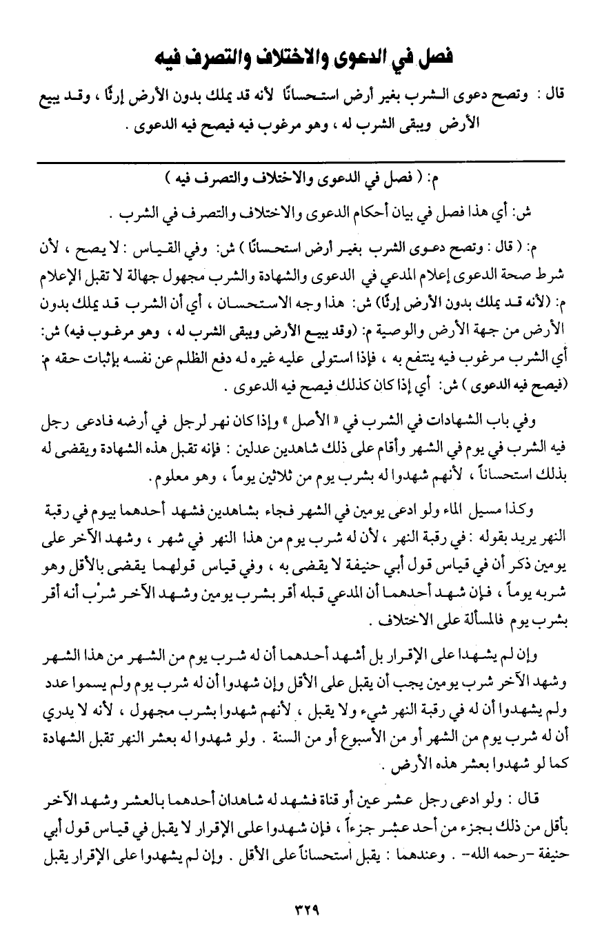 فصل في الدعوى والاختلاف والتصرف فيه قال: وتصح دعوى الشرب بغير أرض استحسانا لأنه قد يملك بدون الأرض إرثا، وقد يبيع الأرض ويبقى الشرب له، وهو مرغوب فيه فيصح فيه الدعوى.