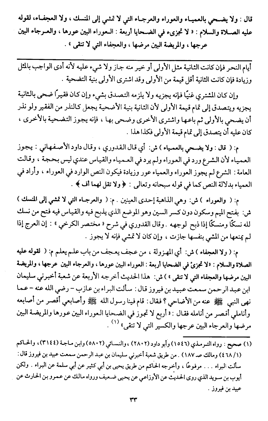 قال: ولا يضحي بالعمياء والعوراء والعرجاء التي لا تمشي إلى المنسك، ولا العجفاء لقوله - عَلَيْهِ الصَّلَاةُ وَالسَّلَامُ -: «لا تجزئ في الضحايا أربعة: العوراء البين عورها، والعرجاء البين عرجها، والمريضة البين مرضها، والعجفاء التي لا تنقى» .