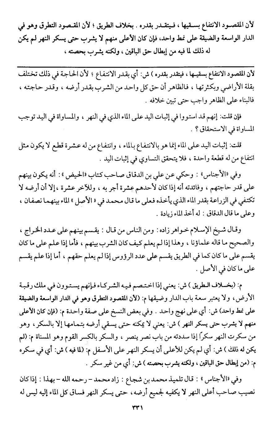 وفي " الأجناس ": قال تلميذ محمد بن شجاع: زاد محمد - رَحِمَهُ اللَّهُ - بهذا: إذا كان نصيب صاحب أعلى النهر لا يكفيه لجميع أرضه، حتى يسكر النهر فساق كل الماء إليه ليس له