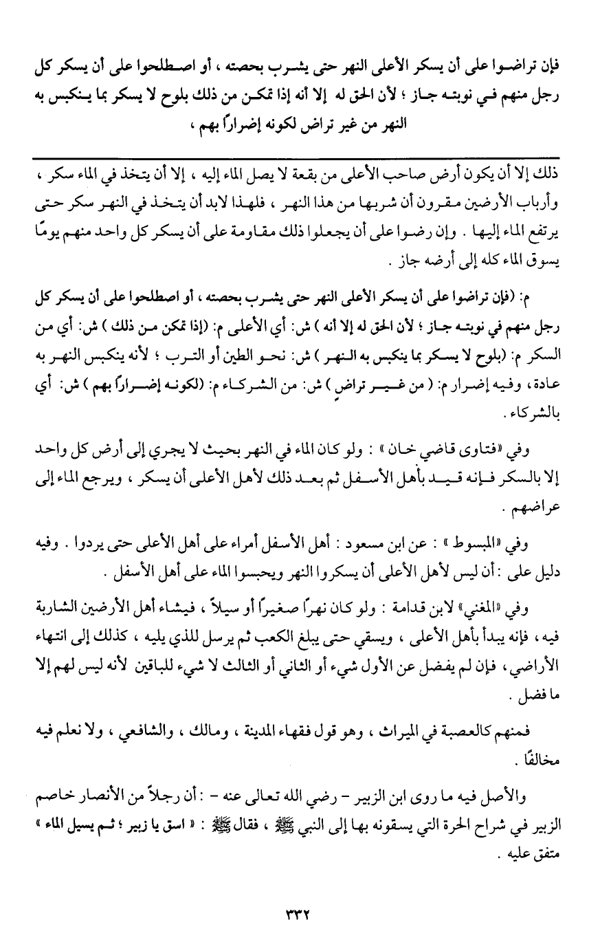 ـــــــــــــــــــــــــــــQذلك إلا أن يكون أرض صاحب الأعلى من بقعة لا يصل الماء إليه، إلا أن يتخذ في الماء سكر، وأرباب الأرضين مقرون أن شربها من هذا النهر، فلهذا لا بد أن يتخذ في النهر سكر حتى يرتفع الماء إليها. وإن رضوا على أن يجعلوا ذلك مقاومة على أن يسكر كل واحد منهم يوما يسوق الماء كله إلى أرضه جاز.