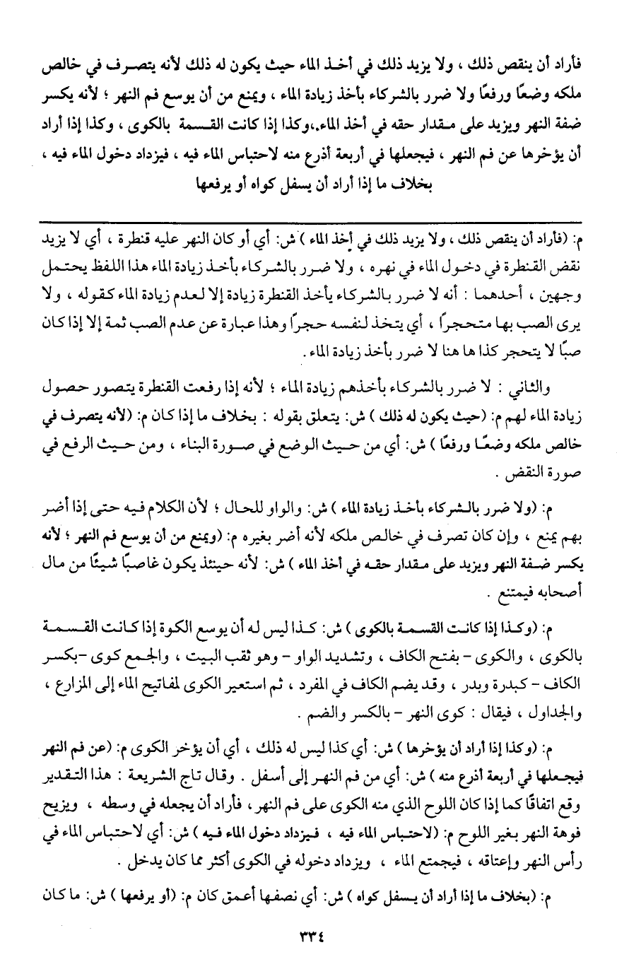 فأراد أن ينقص ذلك، ولا يزيد ذلك في أخذ الماء حيث يكون له ذلك لأنه يتصرف في خالص ملكه وضعا ورفعا ولا ضرر بالشركاء بأخذ زيادة الماء، ويمنع من أن يوسع فم النهر؛ لأنه يكسر ضفة النهر ويزيد على مقدار حقه في أخذ الماء، وكذا إذا كانت القسمة بالكوى،