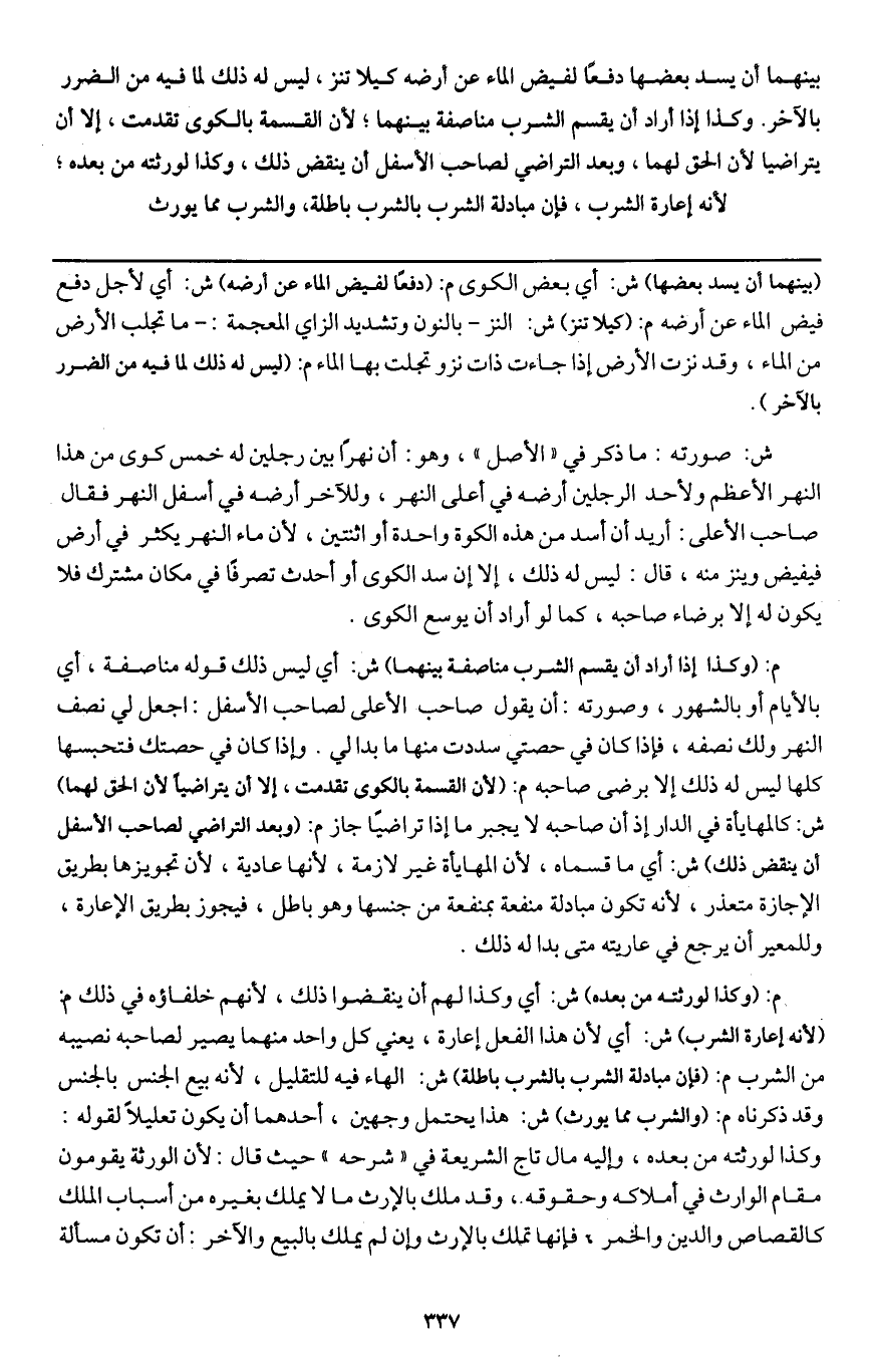 ش: صورته. ما ذكر في " الأصل " وهو: أن نهرا بين رجلين له خمس كوى من هذا النهر الأعظم ولأحد الرجلين أرضه في أعلى النهر، وللآخر أرضه في أسفل النهر فقال صاحب الأعلى: أريد أن أسد من هذه الكوة واحدة أو اثنتين، لأن ماء النهر يكثر في أرض فيفيض وينز منه، قال: ليس له ذلك، إلا إن سد الكوى أو أحدث تصرفا في مكان مشترك فلا يكون له إلا برضاء صاحبه، كما لو أراد أن يوسع الكوى.