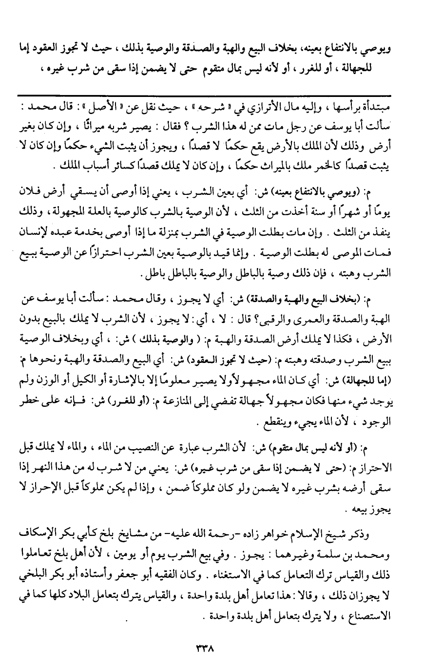وذكر شيخ الإسلام خواهر زاده -رحمة الله عليه - من مشايخ بلخ كأبي بكر الإسكاف ومحمد بن سلمة وغيرهما: يجوز. وفي بيع الشرب يوم أو يومين، لأن أهل بلخ تعاملوا ذلك والقياس ترك التعامل كما في الاستغناء. وكان الفقيه أبو جعفر وأستاذه أبو بكر البلخي لا يجوزان ذلك. وقالا: هذا تعامل أهل بلدة واحدة، والقياس يترك بتعامل البلاد كلها كما في الاستصناع، ولا يترك بتعامل أهل بلدة واحدة.