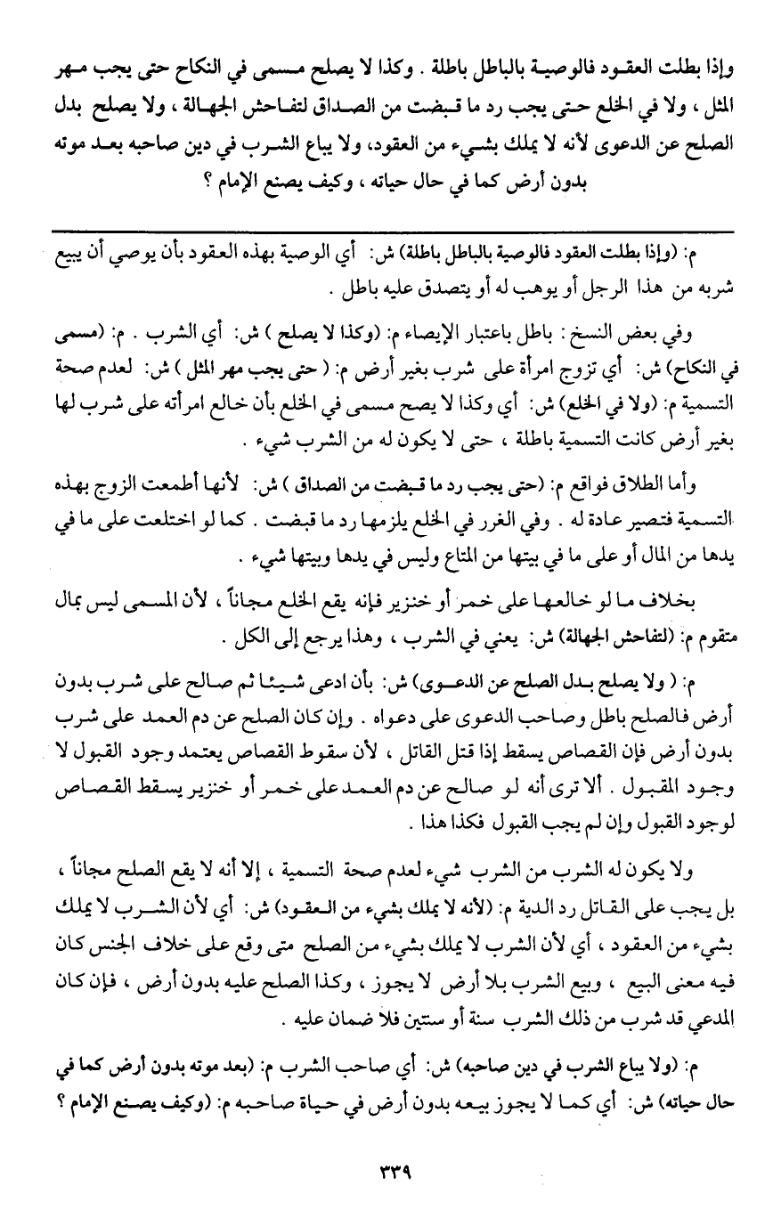 وإذا بطلت العقود فالوصية بالباطل باطلة. وكذا لا يصلح مسمى في النكاح حتى يجب مهر المثل، ولا في الخلع حتى يجب رد ما قبضت من الصداق لتفاحش الجهالة،