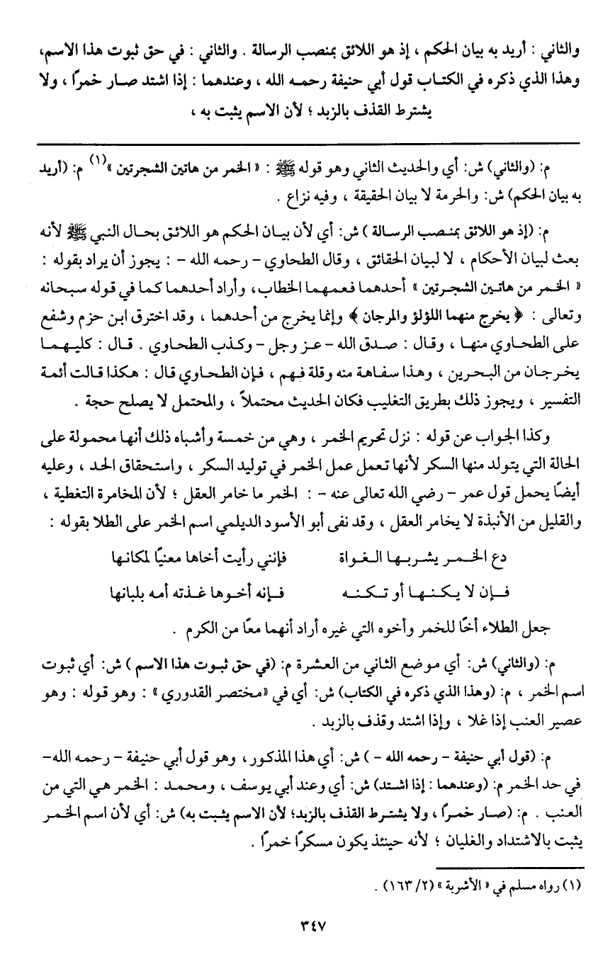 والثاني: أريد به بيان الحكم، إذ هو اللائق بمنصب الرسالة. والثاني: في حق ثبوت هذا الاسم، وهذا الذي ذكره في الكتاب قول أبي حنيفة - رَحِمَهُ اللَّهُ -، وعندهما: إذا اشتد صار خمرا، ولا يشترط القذف بالزبد؛ لأن الاسم يثبت به،