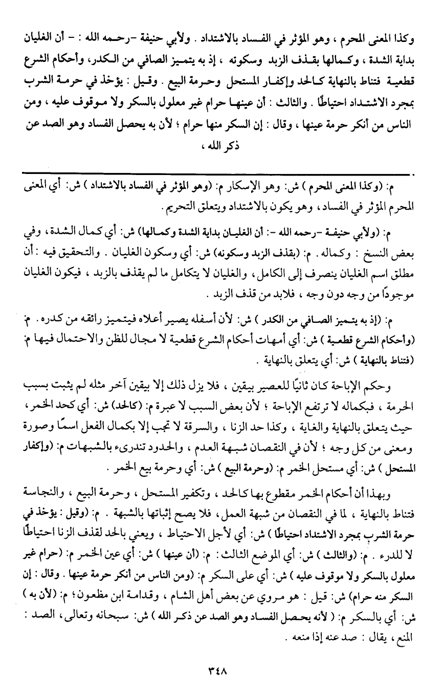 وكذا المعنى المحرم، وهو المؤثر في الفساد بالاشتداد. ولأبي حنيفة - رَحِمَهُ اللَّهُ -: - أن الغليان بداية الشدة، وكمالها بقذف الزبد وسكوته، إذ به يتميز الصافي من الكدر، وأحكام الشرع قطعية فتناط بالنهاية كالحد وإكفار المستحل وحرمة البيع. وقيل: يؤخذ في حرمة الشرب بمجرد الاشتداد احتياطا. والثالث: أن عينها حرام غير معلول بالسكر ولا موقوف عليه، ومن الناس من أنكر حرمة عينها، وقال: إن السكر منها حرام؛ لأن به يحصل الفساد وهو الصد عن ذكر الله،