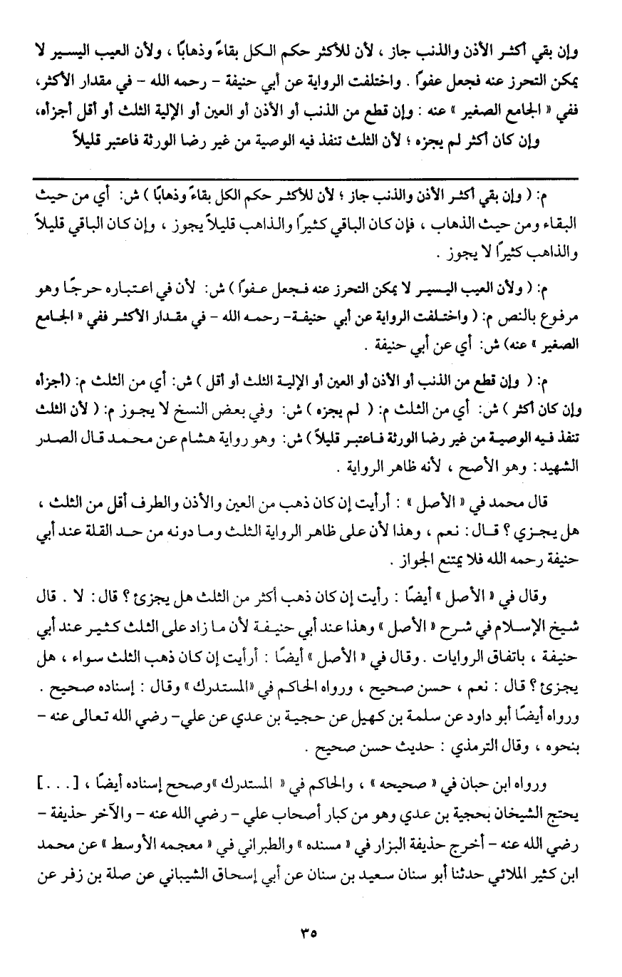 وقال في " الأصل " أيضا: رأيت إن كان ذهب أكثر من الثلث هل يجزئ؟ قال: لا. قال شيخ الإسلام في شرح " الأصل " وهذا عند أبي حنيفة لأن ما زاد على الثلث كثير عند أبي حنيفة، باتفاق الروايات. وقال في " الأصل " أيضا: أرأيت إن كان ذهب الثلث سواء، هل يجزئ؟ قال: نعم حسن صحيح، ورواه الحاكم في " المستدرك " وقال: إسناده صحيح. ورواه أيضا أبو داود عن سلمة بن كهيل عن حجية بن عدي عن علي - رَضِيَ اللَّهُ تَعَالَى عَنْهُ - بنحوه، وقال الترمذي: حديث حسن صحيح.
